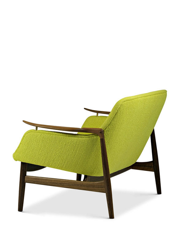 The FJ 53 is an extravagant piece of furniture. It integrates the lightness and elegance of a wooden chair with an upholstered corpus, to embrace the body with genuine comfort. Finn Juhl's characteristic design feature of separating the carrying elements from the carried is also at play in the FJ 53. However, this time the separation is achieved via more sophisticated means to add-in the aforementioned lightness and elegance. The rear legs, completely free from upholstery, protrude from the floor. In a single, unbroken motion they change direction and expand into an organically shaped armrest, almost animalistic in nature. The armrest wraps around the upholstery as if it is levitating, to arrive in a smooth and upwards point, begging to be touched.