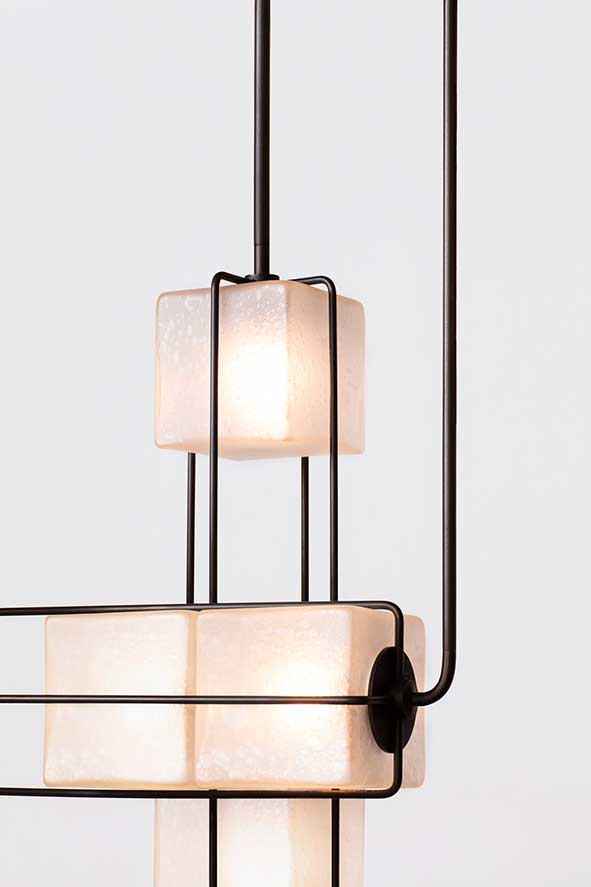 The Alice collection is inspired by brutalist modular architecture. The textured hand blown glass cubes are sandblasted to create a soft glow and stacked together to diffuse light in different intensities. Available in Satin Brass or Blackened Brass.