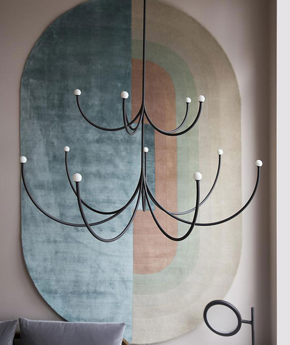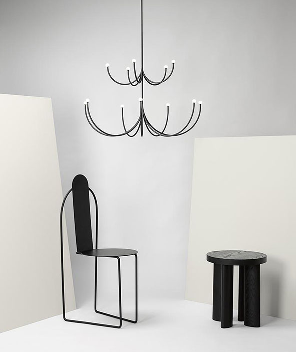 Arca is a lighting system whose form is a play of contrasts between the classical swooping branches and the spare minimalism of its linear, black composition. Tiers can be easily added together to create a unique chandelier.