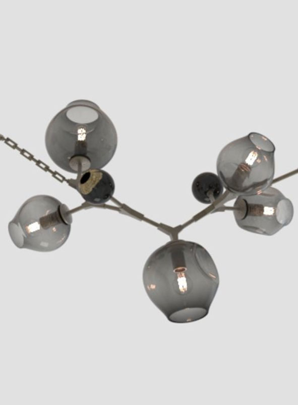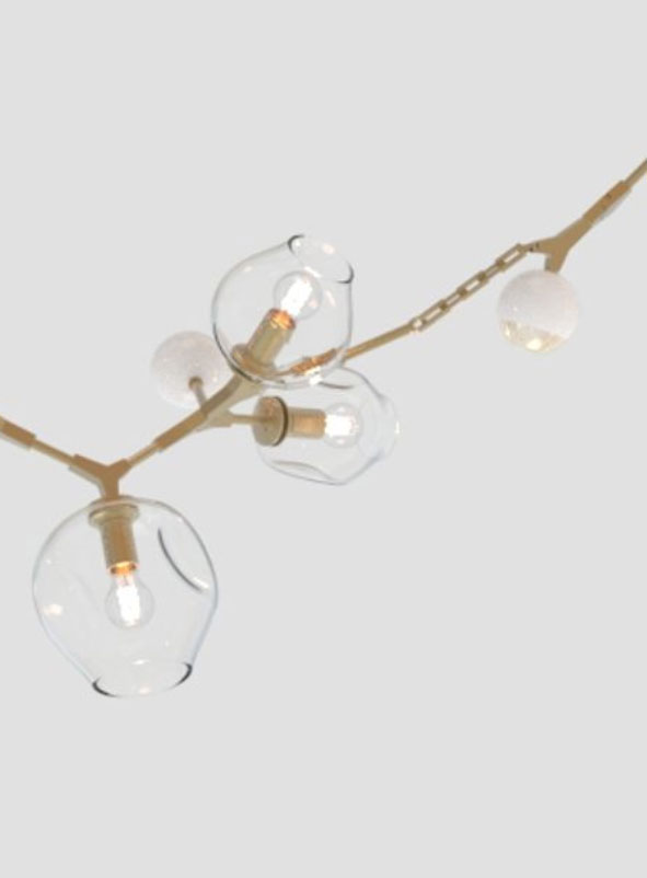 Burst embodies harmony and counterpoint. A celebration of contrasts, it uses the aesthetic language first developed for Branching Bubble, reinterpreted through its own dynamic geometry. A sharp-edged starburst, among its influences, are the elegant angles of medieval weaponry and the contrapuntal art of Ikebana—Japanese flower arrangement—where some stems are spikey and others nod in full bloom. The fixture echoes as well the jeweled brooches designed by the Parisian couturier Jeanne Lanvin in the 1930s, with weighty settings and a balance of bold real and faux gems. Hand-blown globes by Michiko Sakano alternate with glass spikes, as well as barnacle-like spheres rolled in 24-karat gold and finished with projections that resemble tiny bee stingers. With the luminous presence of dark bouquet lit from within, Branching Burst is moody yet buoyant, a bit rebellious, confident and expressive.