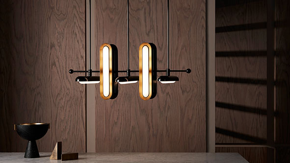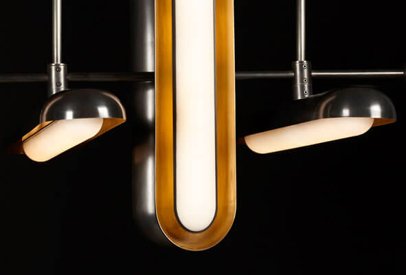 The Circuit 7 creates rhythm with the repetition of pure shapes. A glowing glass capsule nests in a brass shade, becoming a contained form that multiplies to construct larger fixtures.