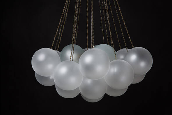 Glass orbs are frosted by hand to create an irregular texture reminiscent of 19th century glass frosting techniques. Three central light sources emit a soft glow that is refracted through the surrounding cluster of orbs.