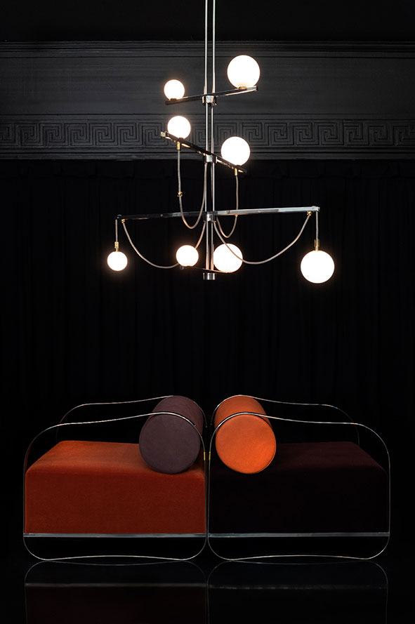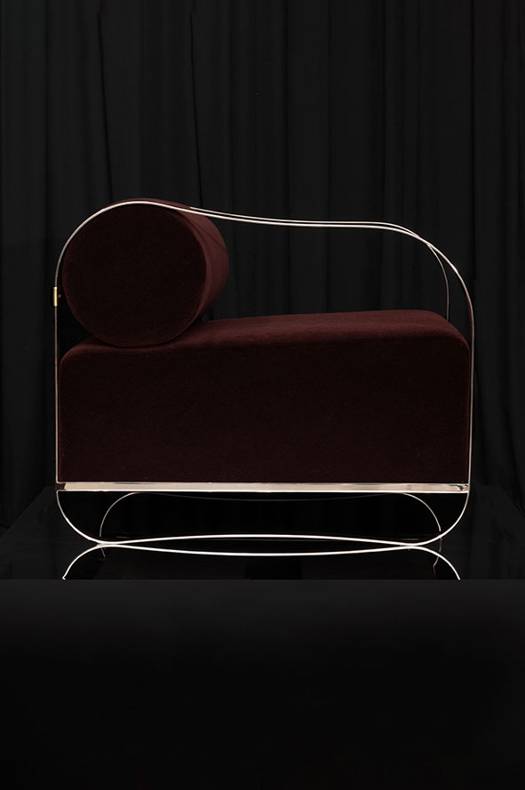 An interplay of Modernism and Art Deco influences, the DADA armchair is made of a polished stainless steel frame, with polished brass accent hardware that holds a round bolster as the back support and gives the chair its playfulness and comfort.