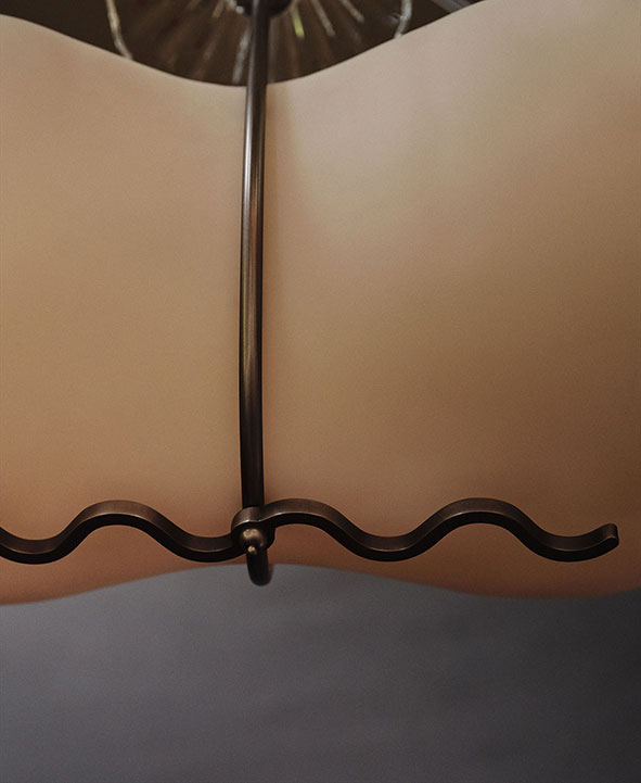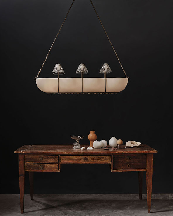 A monumental basin of tinted cast acrylic topped with hand-made scalloped glass cones is hung from and encased within an armature of nickel plated and patinated steel, replete with small details of decoration and joinery.