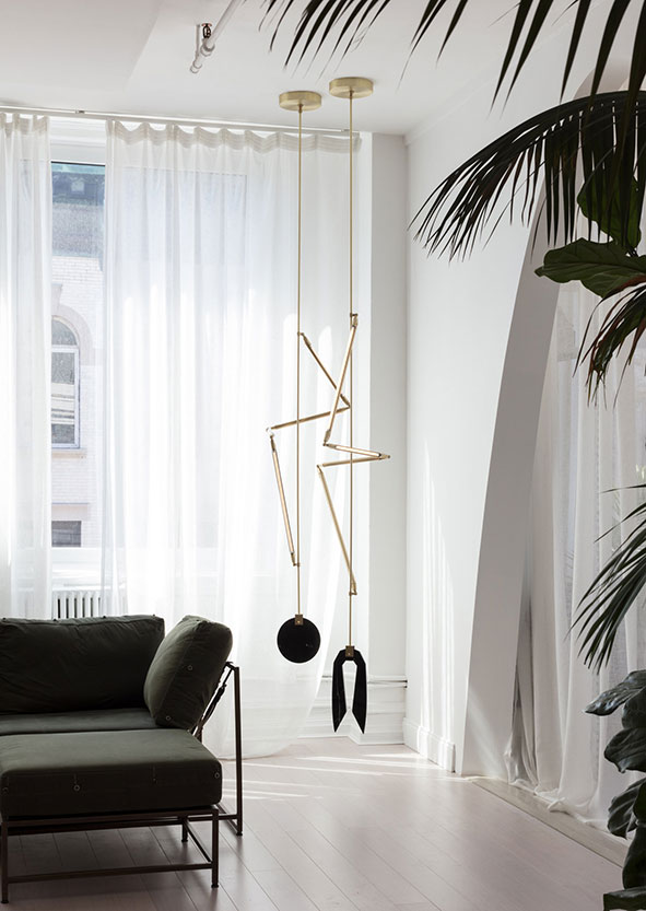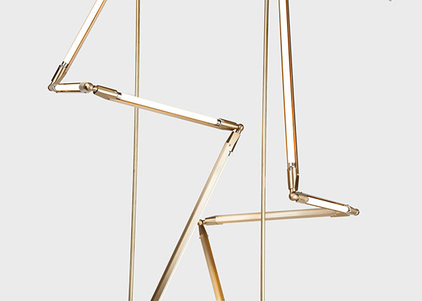 Helix is composed of custom brass hardware and LED tubes that wrap around a central support in a lean, angular composition. Helix is available with a stone counterweight for hanging fixtures, and in any of our standard brass finishes.