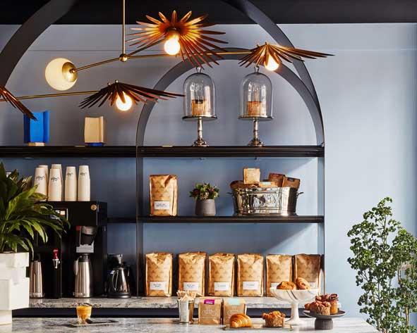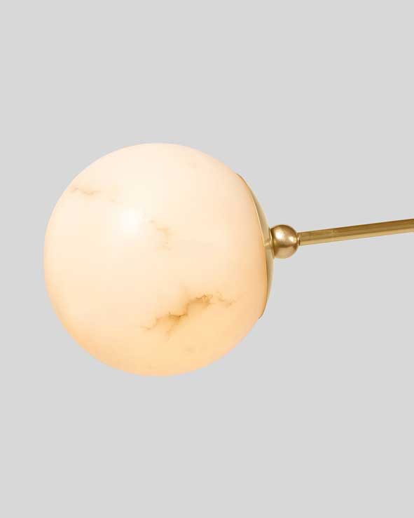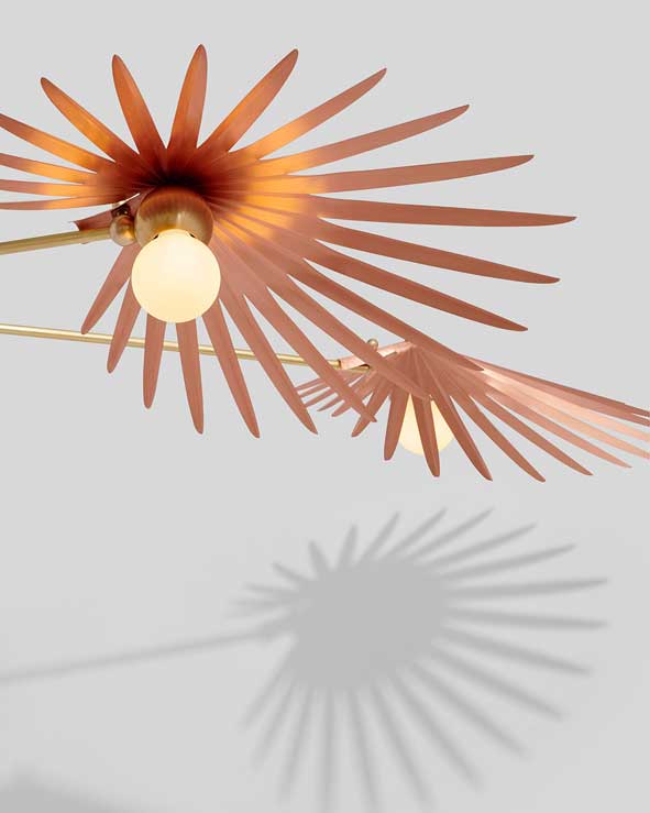 Inspired by the forests of Yucatán, the Inez collection recalls the natural architecture and structural folds of the fan palm. Hand-pleated copper shades with rich, salt patinas are balanced by rounded alabaster counterweights.