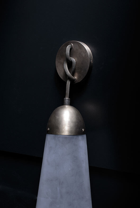 Lariat sconce are etched glass teardrops hang from woven brass mesh. Taut lines are weighted by elongated orbs, addressing an intersection of geometry and gravity.