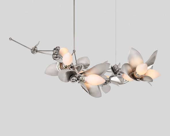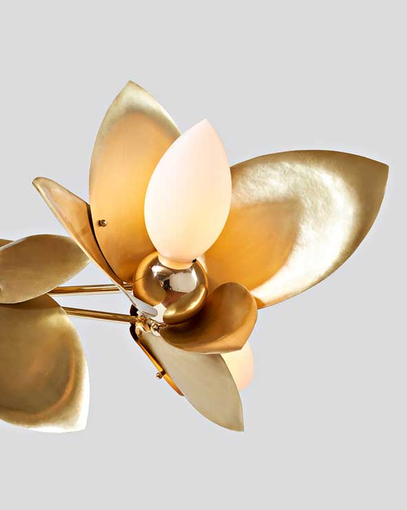 Hand-hewn elements are paired with machined parts to form lighting works that embody organic growth, levity and movement. Blossom explores branching forms and hammered brass leaves, layered around oblong milk glass buds.