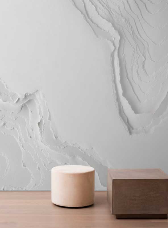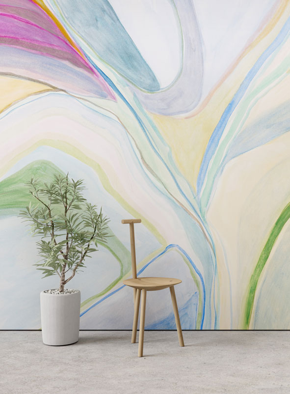 Scattered across distant islands, homes gather, nestling into coves where sea meets land, and the towns take on a singular collective architecture. From the sea you see an assemblage of forms. From the land, glimpses of the endless blue horizon are caught through apertures. Lyric looks in both directions at once, following the clean line of a church’s dome, the curve of alcove, or the twisting corner of a stairway. It illustrates the interaction between these fluid architectural forms and the crisp angles cast by the sun as the day passes, creating ever-changing patterns that are at once geometric and random.