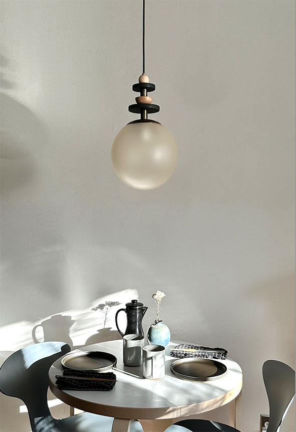 Stacked beads in copper, brass, blackened oak, maple, and clear acrylic create jewelry-inspired compositions above a simple opal glass globe. Bead stacks available in three heights (short, medium, tall). Pendants may be clustered together to create a varied arrangement of materials and textures. Accepts A15 bulbs (halogen or LED) and is wired to both US and international standards. UL approved up to 25w. Fixtures come hardwired for permanent installation with 8' of fabric wrapped warm dark gray cord and a 5" black round canopy. Bulb is included on domestic orders.