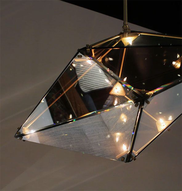 Bec Brittain's Maxhedron is a study in material transformation through light and reflection. When off, the partly-translucent Maxhedron reflects and blends with its environment; when on, the dazzling inner constellation of bulbs projects bands of light onto nearby surfaces.
