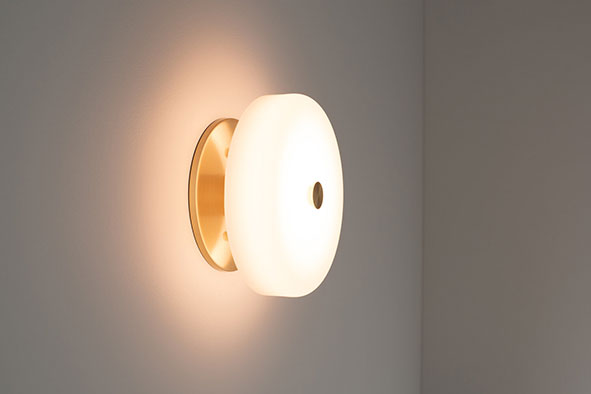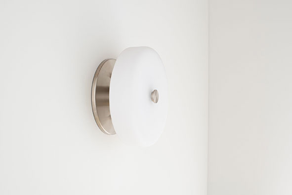 A modern hand-blown glass disc floats effortlessly off the wall providing distinct dimmable illumination.