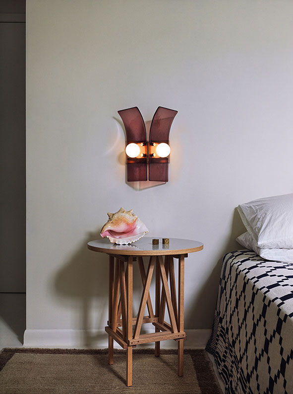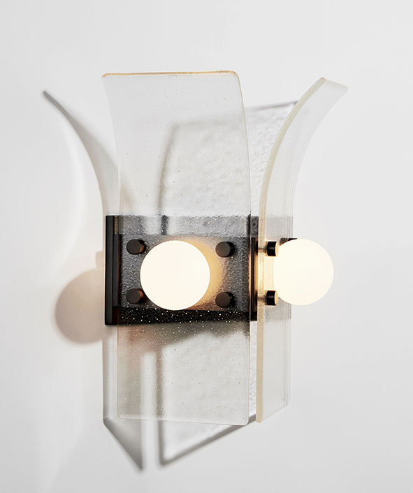 Drawing inspiration from the beach modernism of the Fire Island Pines, the Palm series combines hand rolled, kiln slumped glass and precision machined steel or brass elements. The subtle texture and soft edge of the glass provides a warm counterpoint to the metal’s strict lines.