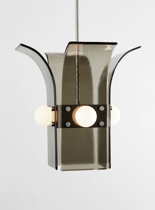 Drawing inspiration from the beach modernism of the Fire Island Pines, the Palm series combines hand rolled, kiln slumped glass and precision machined steel or brass elements. The subtle texture and soft edge of the glass provides a warm counterpoint to the metal’s strict lines.