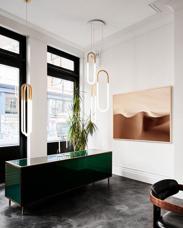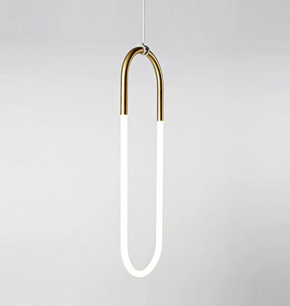 Jewelry is the inspiration for Rudi, a series of pendant lamps named after Lukas Peet's father, a jeweler. Rudi is made from bent metal tubes that hold hand formed glass housing an LED lamp. The fixtures hang from their cords, which are hand-knotted around metal tubes.