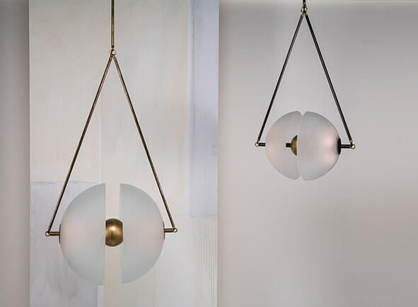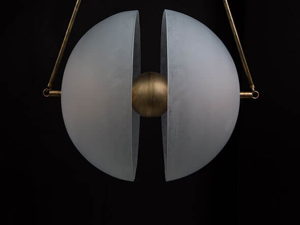 Inspired by the mechanics of neural synapses, the Synapse pendant is composed of two hand-molded glass domes that require a 4-part firing process. A brass orb floats in transit between the two hemispheres.