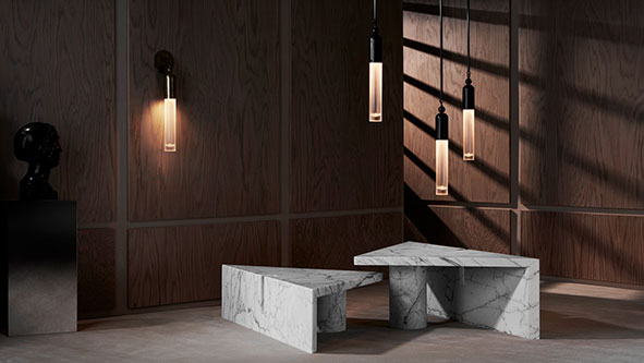 The tassel series condenses the warmth and decadence of a traditional chandelier to a concise, modern conclusion. Emanating from a brass dome, the light is amplified as it refracts through mold-blown glass cylinders.