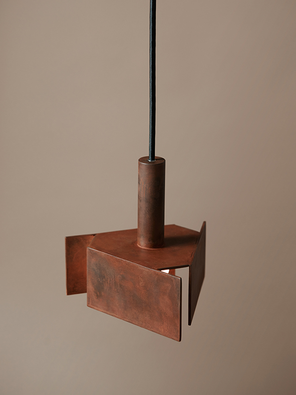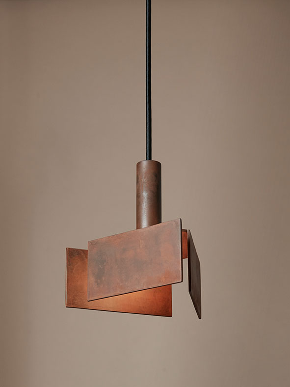 The Tripp lighting line combines the grounded stability of a strict geometric form with the radial energy of a spiral’s expansive movement.