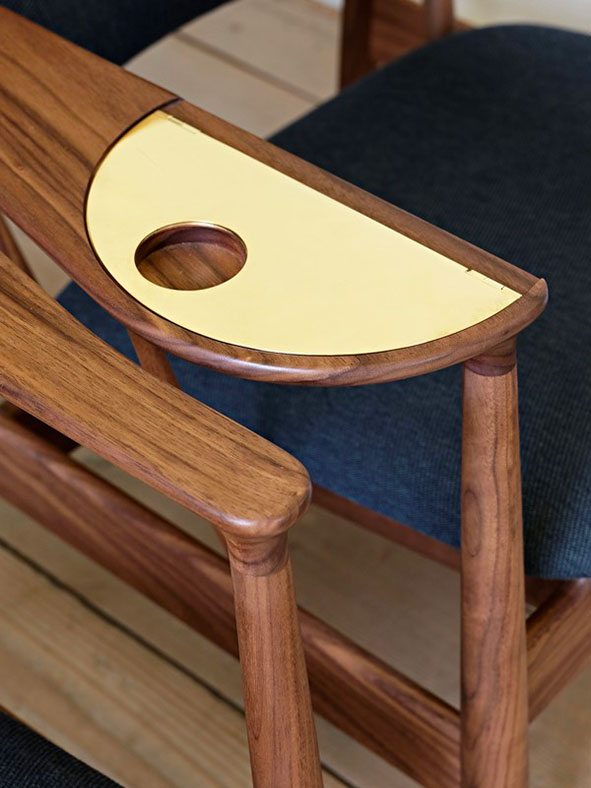 Ludique et provocant, le fauteuil est doté d’un accoudoir droit qui se déplie, laissant place à un plateau en laiton en forme de demi-lune, fait à la main et de pieds en laiton caractéristiques. Le plateau peut se déplier en un cercle complet où un trou dans la surface en laiton est façonné pour contenir un verre. Le Whisky Chair est extrêmement confortable et vous invite à partager un moment privilégié d'immersion et de plaisir.