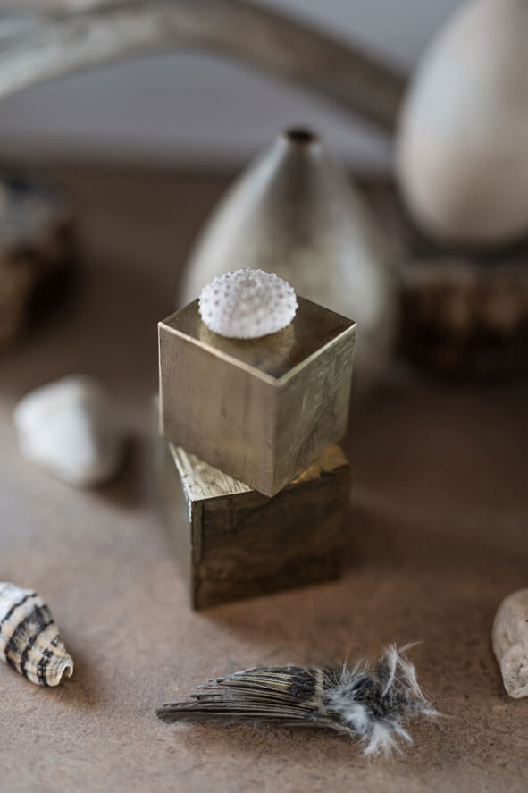 L’atelier de John Pomp est rempli de collections de curiosités éphémères et d’objets qui en disent long sur les origines esthétiques de ses créations. Qu’il s‘agisse de souvenirs naturels ramassés lors de sessions de surf comme des plumes, fossiles, cristaux et écorces ou des chutes de verre, métal et autres résidus de procédés de fabrication, toutes ces sources d’inspiration expriment la philosophie Wabi Sabi dont le travail de John Pomp est empreint. Parmi les bols japonais, la poterie scandinave et les anciens outils de mesure, on trouve notamment le premier morceau de verre jamais fabriqué par le designer. L’ensemble de ces objets souligne la beauté brute des matériaux naturels et inspire le design de chaque création.