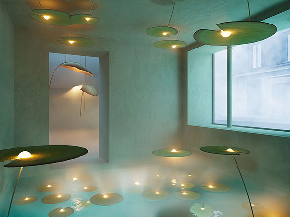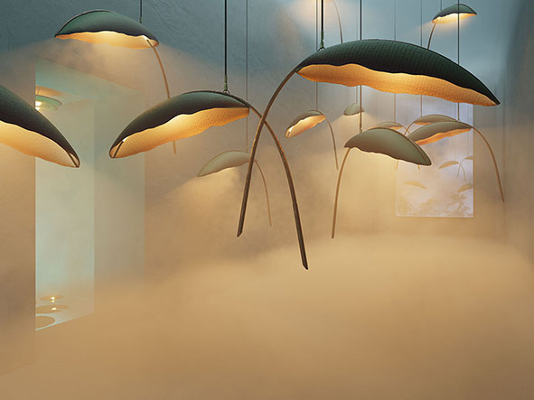 « Pour repenser la galerie de Triode de manière digitale, nous avons imaginé un bosquet dense de lampes Nana Lure et ce que ce serait de marcher parmi elles. Comme si l'on entrait dans une peinture, la galerie devient une oasis luxuriante de Nana Lure, un répit fantastique dans la ville. »