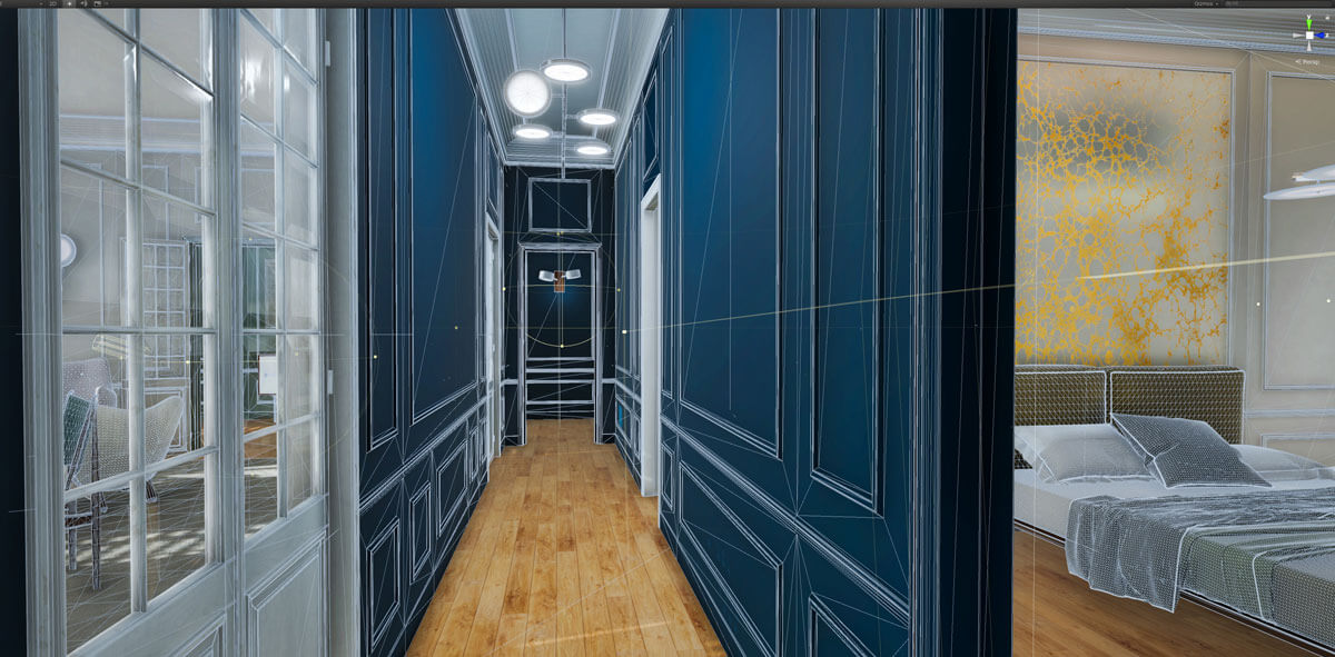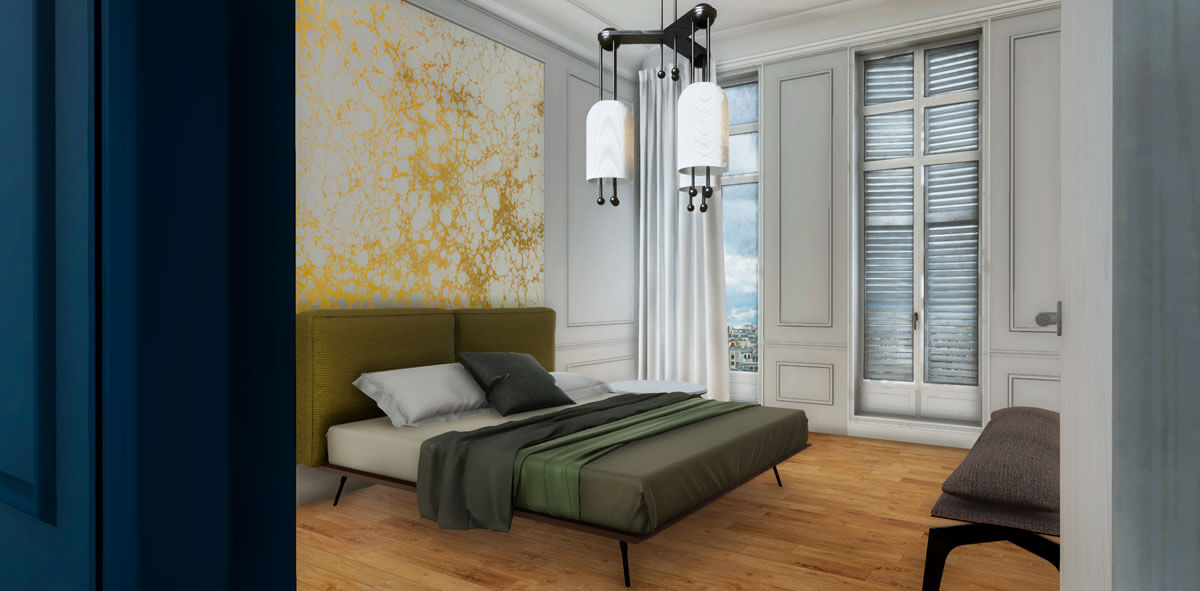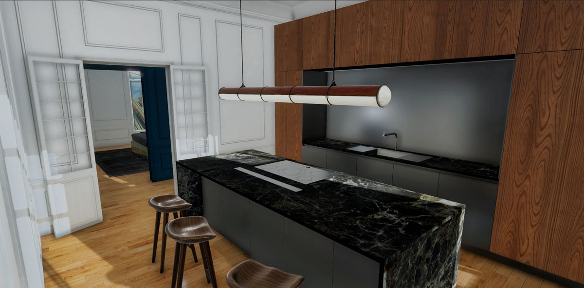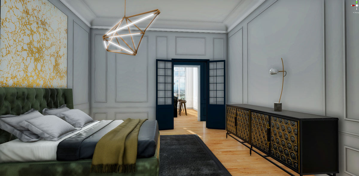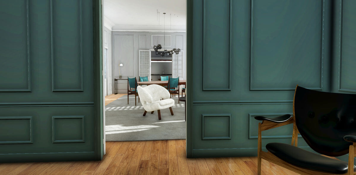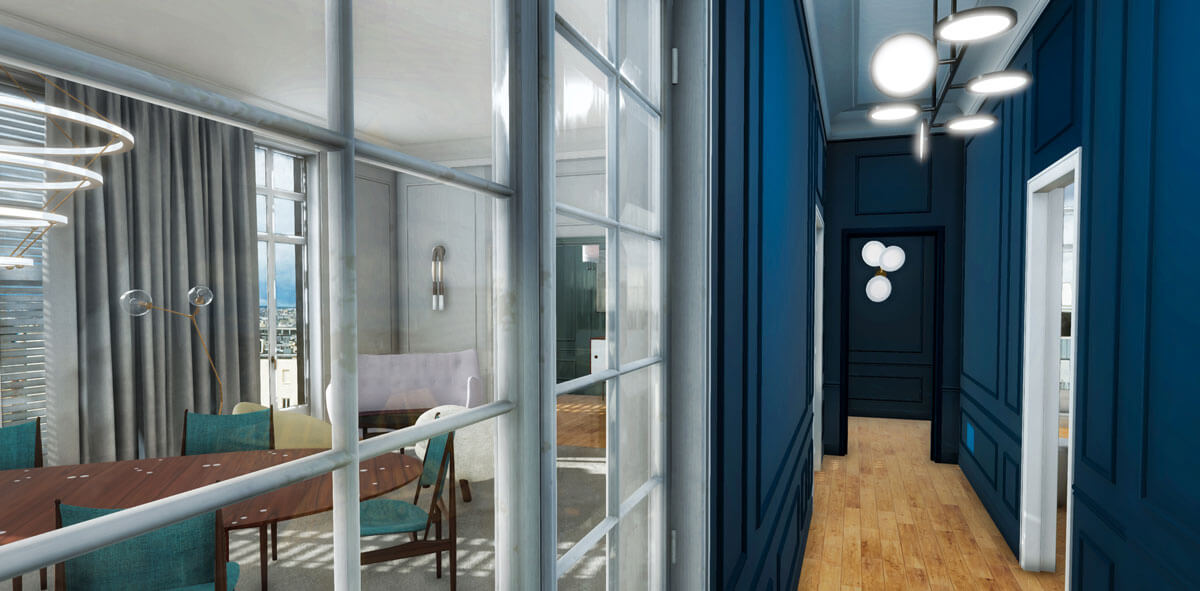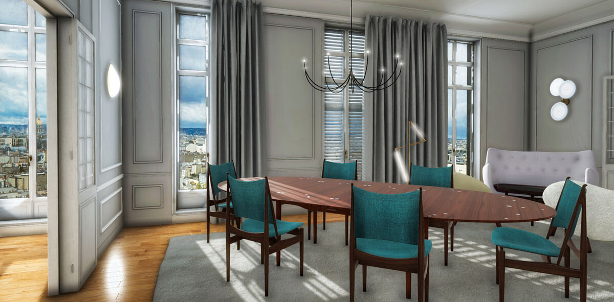 Un appartement parisien classique de 120 m2 dans lequel les architectes sont invités à déambuler pour découvrir le design américain défendu par la galerie. « Je suis amoureux de notre adresse de la rue Jacob qui est à la fois intime et au centre de tout, mais la petitesse de l’espace nous empêche parfois de montrer certaines pièces monumentales et nous oblige à faire des choix sur les marques que nous mettons en avant. » résume Jacques Barret. « J’ai donc cherché à développer une extension virtuelle pour les architectes. Un appartement familial entièrement digital dans lequel ils peuvent déambuler et changer d’un clic un lustre ou un papier peint. C’est vertigineux. Nous pouvons mettre en situation tous les créateurs et marques américaines que nous voulons faire découvrir aux parisiens ! » résume Jacques Barret.