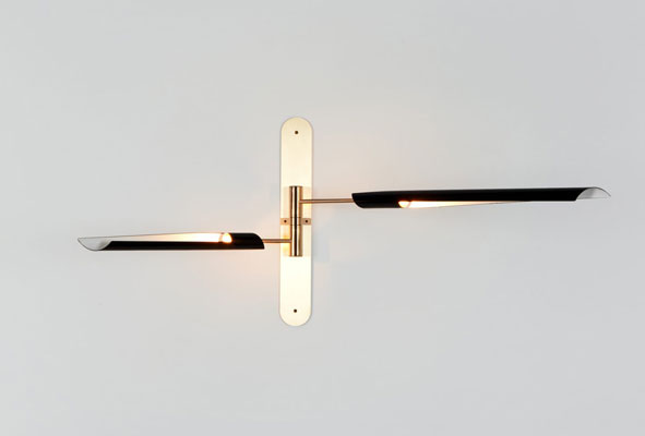 Collaboration du designer américain David Weeks avec Roll & Hill, Boden Sconce 02 est une applique sculpturale au design complexe, présentant des points d'équilibre irréguliers. Ses composants raffinés ont été conçus pour être polyvalents. Véritables éléments architecturaux, ils permettent aux abats-jours de pivoter pour diffuser la lumière de manière directionnelle. Ce luminaire élégant en laiton et aluminium est disponible en finition noir brilliant.