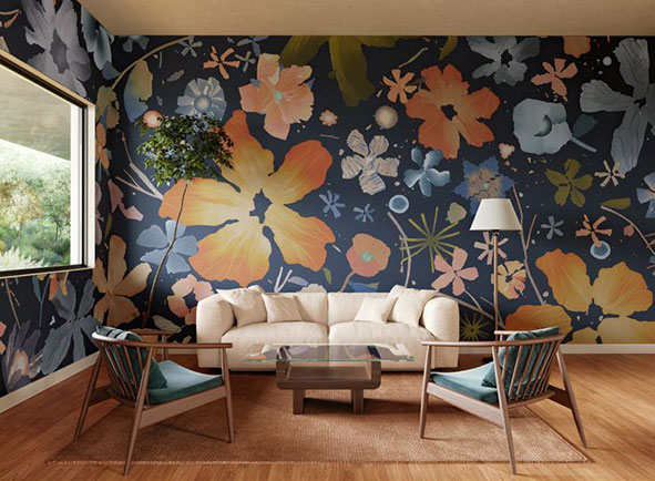 La collection de papier peint Botanica est une collaboration de Calico Wallpaper avec Cody Hoyt qui associe les formes d'art de la peinture, de la gravure et de la céramique. Maître autodidacte de la technique japonaise du nerikomi, qui consiste à superposer des argiles de couleurs différentes pour former des motifs complexes, l’artiste incruste plutôt qu'il ne peint et façonne l'argile.