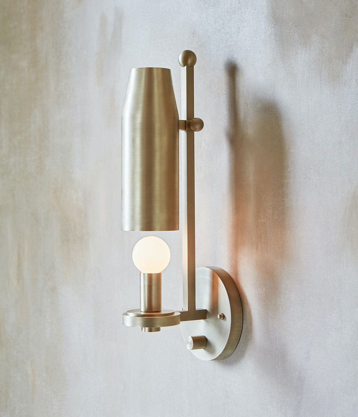 L'applique Chamber Sconce présente un abat-jour en métal pouvant être ajusté pour dissimuler ou révéler la lumière.