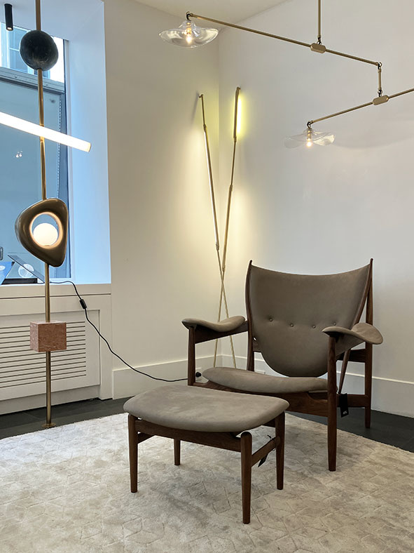 Fauteuil Chieftain Chair avec repose-pied de Finn Juhl disponible au showroom, dans cette finition.