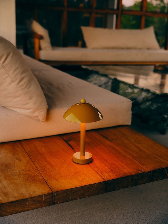Une lampe de table élégante qui apporte une touche de fantaisie - et une flexibilité intérieur-extérieur. Parmi ses détails astucieux : une LED qui s'allume et se réchauffe, un variateur décoratif et une batterie rechargeable d'une durée de 10 heures.