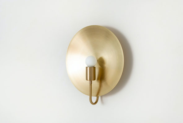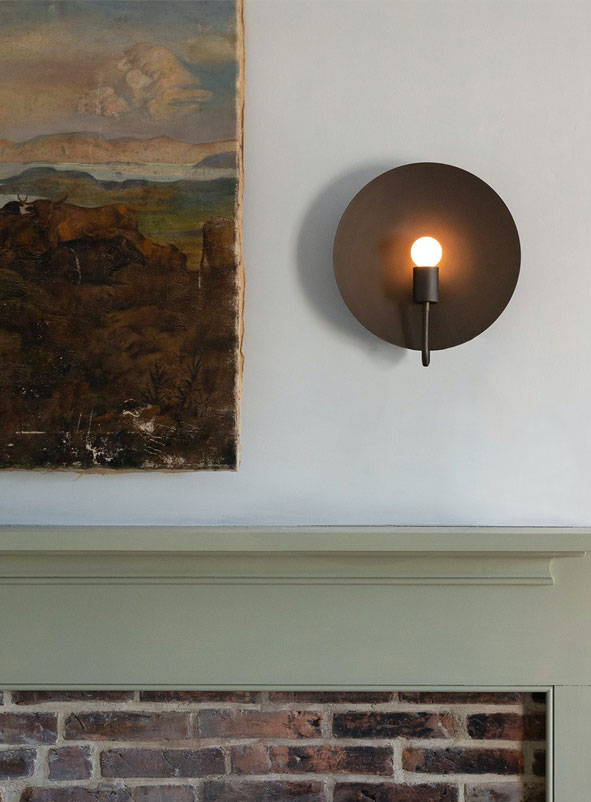 L’applique Helios ADA Sconce présente un disque monumental en métal repoussé qui amplifie l'éclat d'un seul point lumineux, évoquant la magnitude des planètes à l'échelle humaine. Résistante à l’humidité, elle peut être installée dans une salle de bain.
