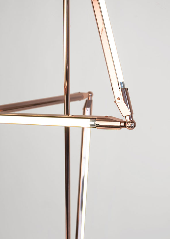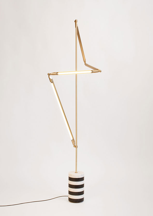 Helix Floor de Bec Brittain présente une composition linéaire et angulaire. Une structure en laiton et des tubes LED s'enroulent autour d'une tige centrale.