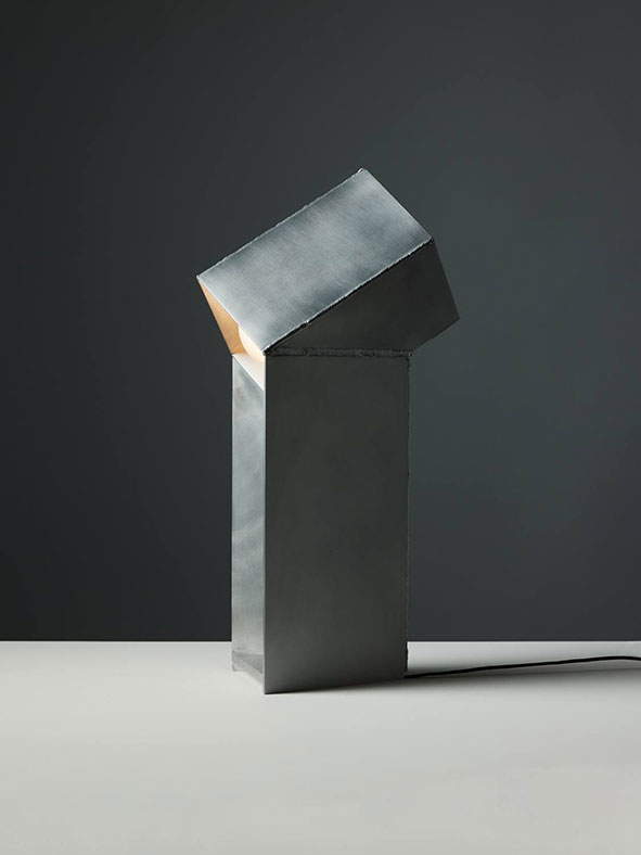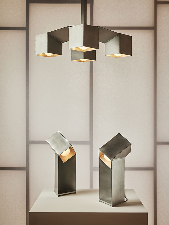 La collection Helm rassemble des œuvres métalliques à la présence audacieuse, construites à partir de lourdes plaques d'aluminium et d'une menuiserie soudée expressive. Elle comprend deux suspensions, une applique et une lampe de table.