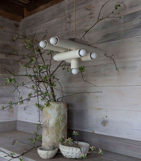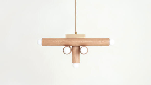Hieroglyph Pendant du studio de design américain Workstead est composé de cylindres en bois imbriqués, rappelant la collection Lodge. Avec ses 9 ampoules, la suspension diffuse une belle lumière.