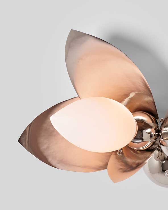 La collection Blossom de la designer américaine Rosi Li explore les formes ramifiées et les feuilles de laiton martelées, superposées autour de bourgeons de verre laiteux oblongs. L’applique Laurel Blossom 02-Light Sconce présente des éléments taillés à la main, associés à des pièces usinées pour former des créations lumineuses qui incarnent la croissance organique, la légèreté et le mouvement. Fabriquée en laiton et verre, elle est disponible en différentes finitions.
