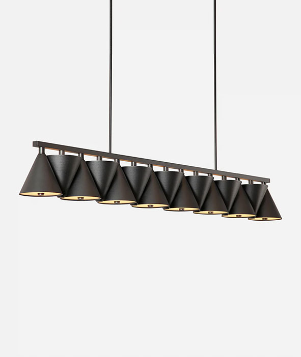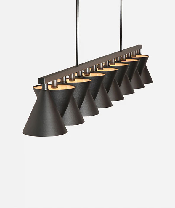 Collaboration de Lucha Nichetto avec Matter Made, la collection Legato est une référence musicale indiquant une connexion fluide et ininterrompue de notes. La suspension Legato Linear est un système modulaire de lumières qui suit ce même principe. Le luminaire linéaire se compose de cônes côte à côte orientés vers le haut et vers le bas et fournit à la fois une lumière douce réfléchie par le plafond et un éclairage direct, ce qui en fait un excellent choix dans les salles à manger et au-dessus des plans de travail.