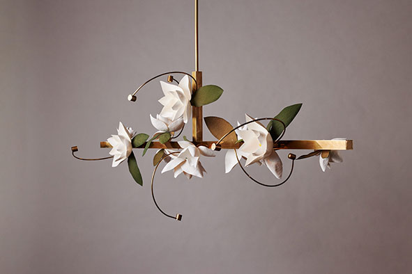 Le Lure Chandelier 6 avec feuilles est composé de fleurs de magnolia en papier de coton moulé avec pétale ssculptées à la main. Chaque fleur est éclairée par une source lumineuse soutenue par un mince arc en laiton. Le lustre offre ainsi une source d'éclairage douce.