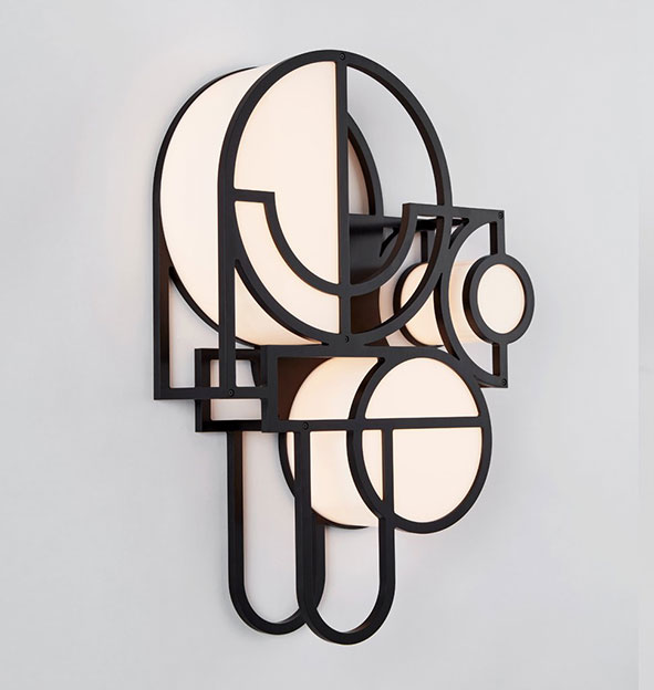 Collaboration de Lara Bohinc avec Roll & Hill, Moonrise Sconce 02 s’inspire des phases lunaires. Cette appliqe en acrylique, acier et aluminium présente des compositions de formes ludiques rondes et demi-rondes. Disponible en finition laiton ou noir mat, ce luminaire évolue selon l'angle de vue, comme les formes changeantes de la lune tout au long de son cycle.