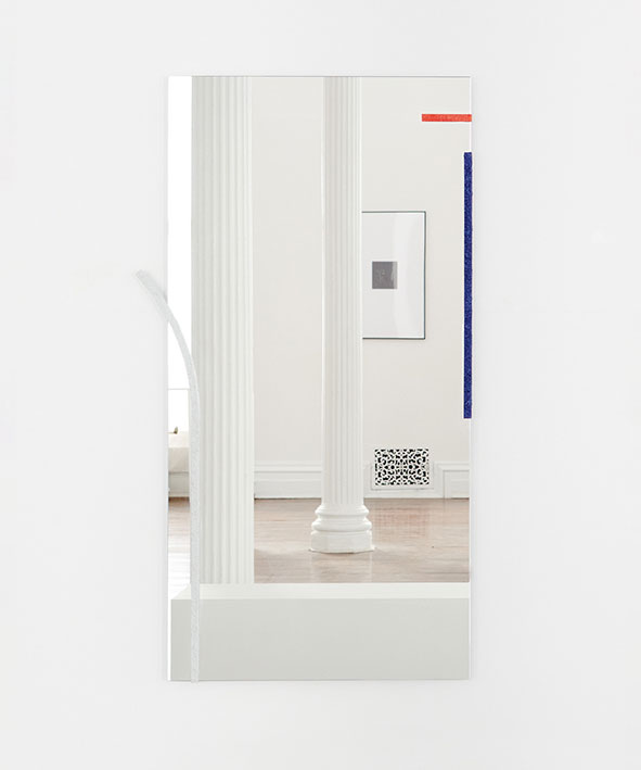 Objet unique, le miroir Oko 2 présente une juxtaposition de clips métalliques texturés et colorés, placés à côté d'un verre lisse et réfléchissant. Il évoque le contraste ludique d'un crayon sur du papier.