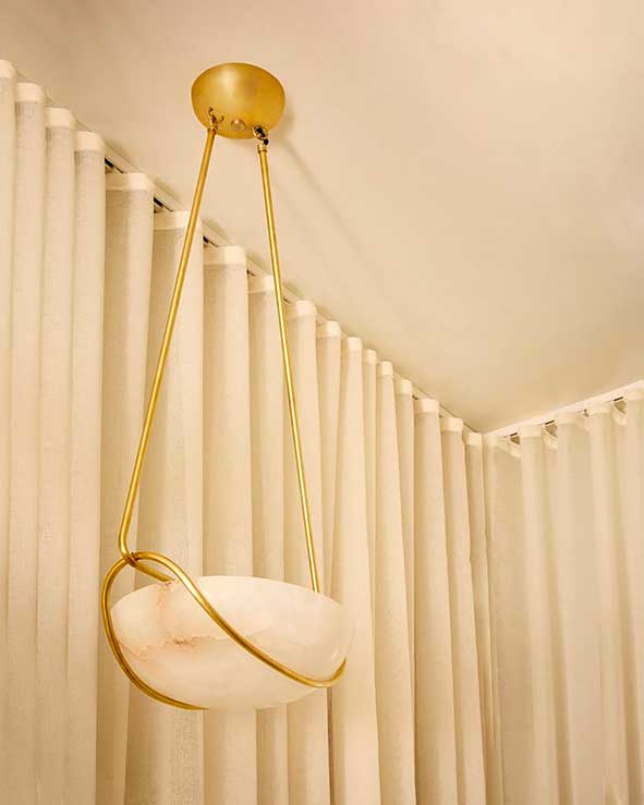 La suspension Séléné symbolise les phases de la lune et la lumière qui guide le ciel océanique. Façonné de manière artisanale par Atelier de Troupe dans leur studio de Los Angeles, ce luminaire exquis est méticuleusement fabriqué en laiton massif et en albâtre et disponible dans des finitions variées.