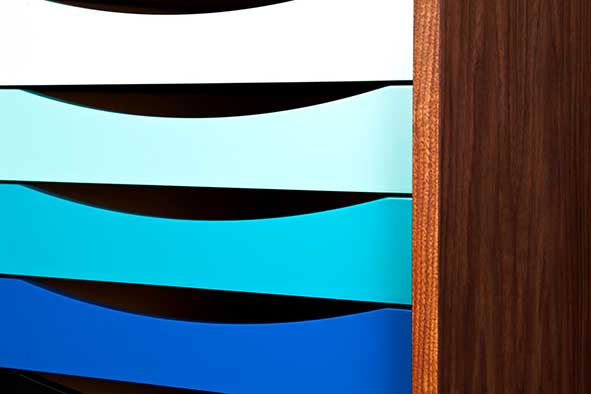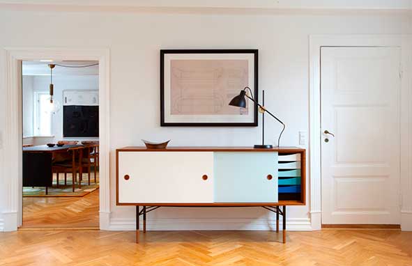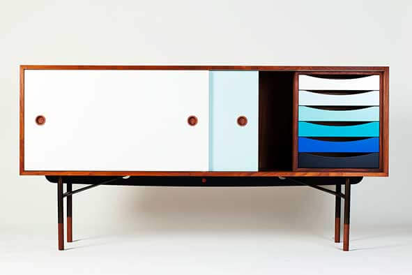 Conçu en 1955, le Sideboard Finn Juhl est simple et beau. Ce buffet se distingue par l'usage de bois exclusifs avec les six couleurs de la roue chromatique de Goethe. Le Sideboard est un exemple de savoir-faire hors norme avec ses portes coulissantes et tiroirs disponibles en teck, chêne, noyer ou placage de pin de l'Oregon ou peints. Le cadre est disponible en acier poli ou peint en noir, orange ou bleu clair. De plus, le buffet est disponible avec ou sans caisson de six tiroirs dans une gamme de couleurs chaudes ou froides.