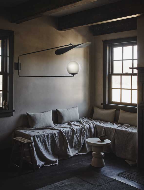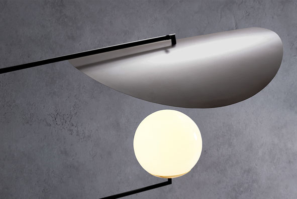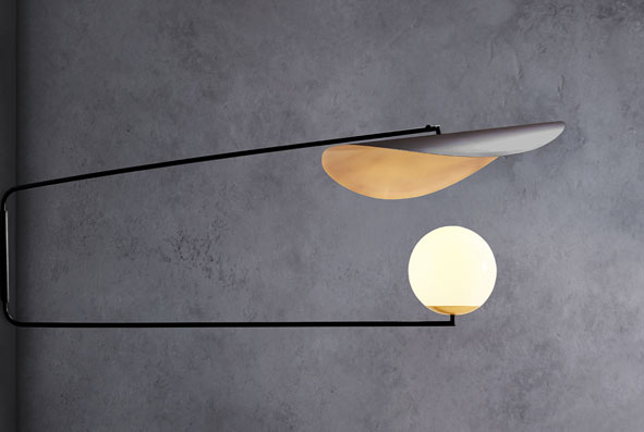 L’applique Sun Shade de la designer américaine Anna Karlin imite la vison d’une belle femme protégeant son visage du soleil, sous un chapeau à large bord. Elle présente un bras articulé, permettant de diriger la lumière de la manière souhaitée et est disponible en finition noir et laiton.