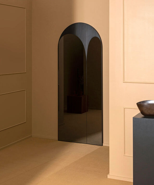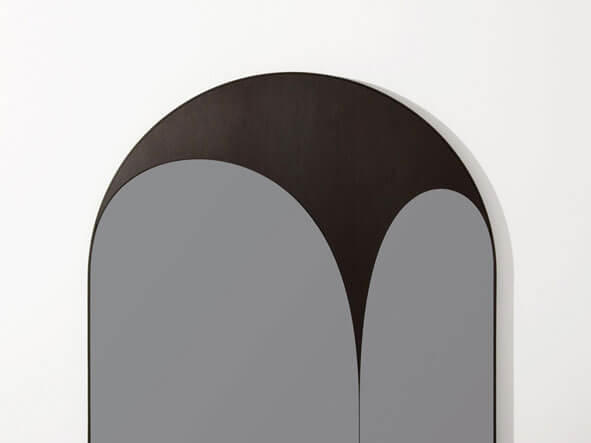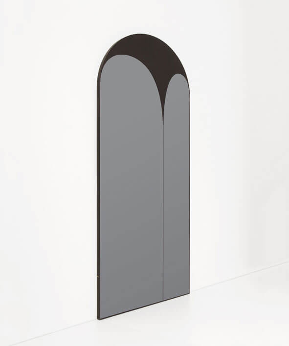 Le miroir Svale Mirror présente une silhouette d'hirondelle abstraite en noyer noirci, complétée par un miroir teinté gris. Cette pièce fonctionnelle décorative prend la forme d’une arche, thématique dans le travail des designers américains Bower, et telle une porte fenêtre agrandira l’espace de tout intérieur.