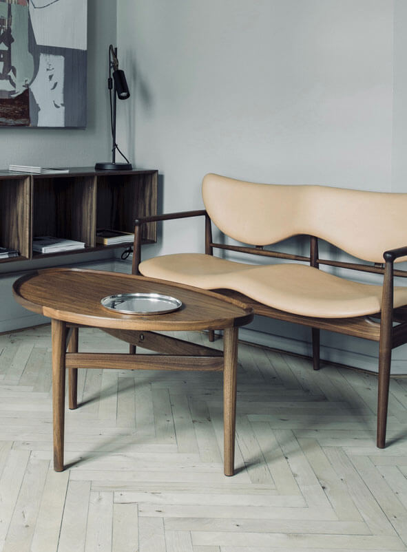 Description Plateau Turning Tray de Finn Juhl. Plusieurs exemplaires disponibles au showroom, de différentes tailles et finitions.