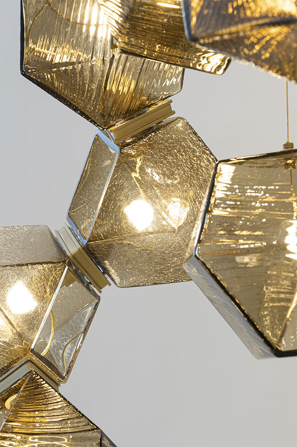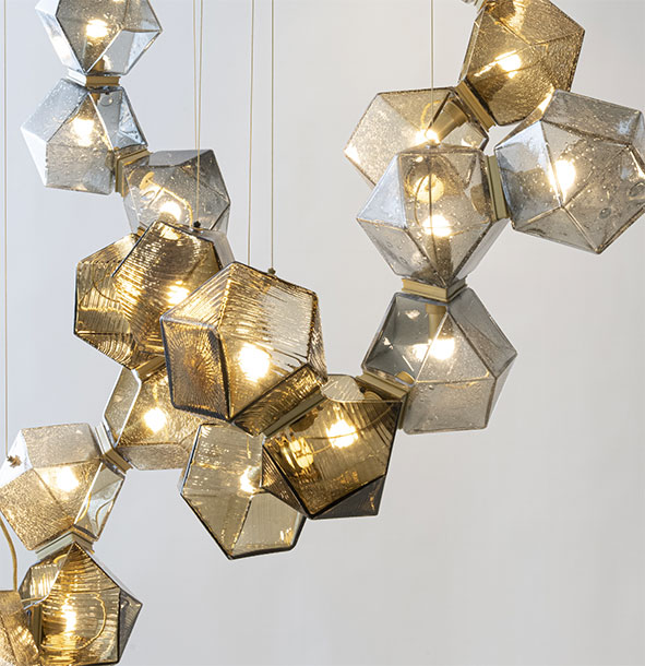 Inspirée de la joaillerie, la collection Welles de Gabriel Scott trouve son équilibre entre une forme géométrique et un volume de verre dépoli, maintenu audacieusement par des broches métalliques satinées. La finition en verre texturé déforme la lumière et crée des illusions optiques magiques lorsqu'on regarde à travers le verre.