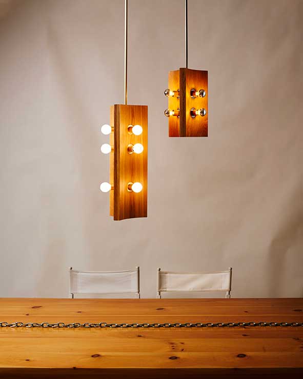 Cette suspension minimaliste en bois est un hommage à la passion du studio de design américain Blue Green Works pour le skateboard.