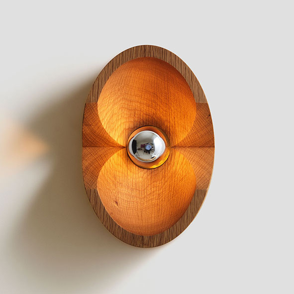Wood Sconce Oval accueille dans ses demi-lunes miniatures une ampoule centrale, dont le centre semi-circulaire sculptural retient la lumière et lui permet de s'échapper sur le mur.